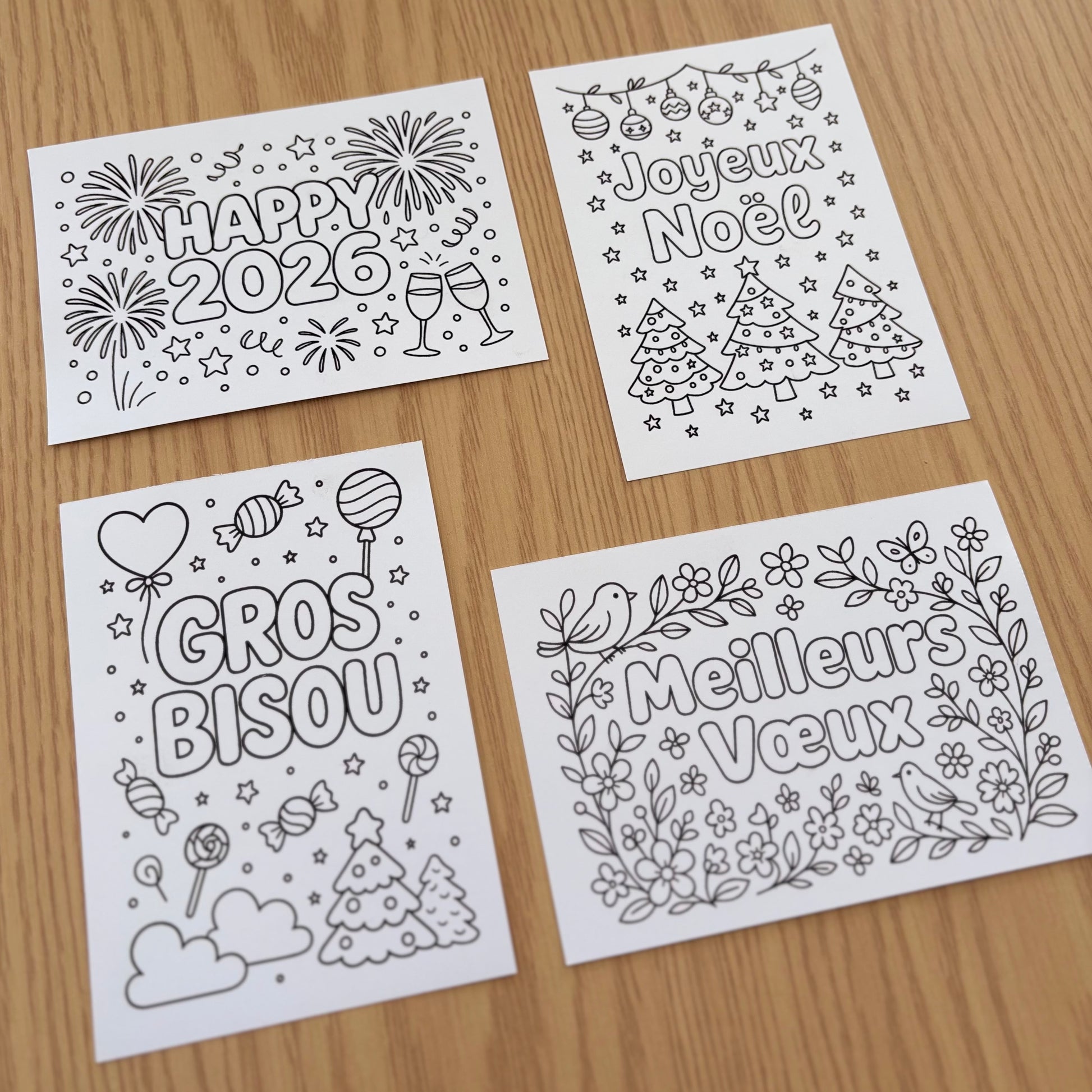 - 1 lot de 4 cartes de vœux à colorier papier 250g (105x148 cm, format A6)